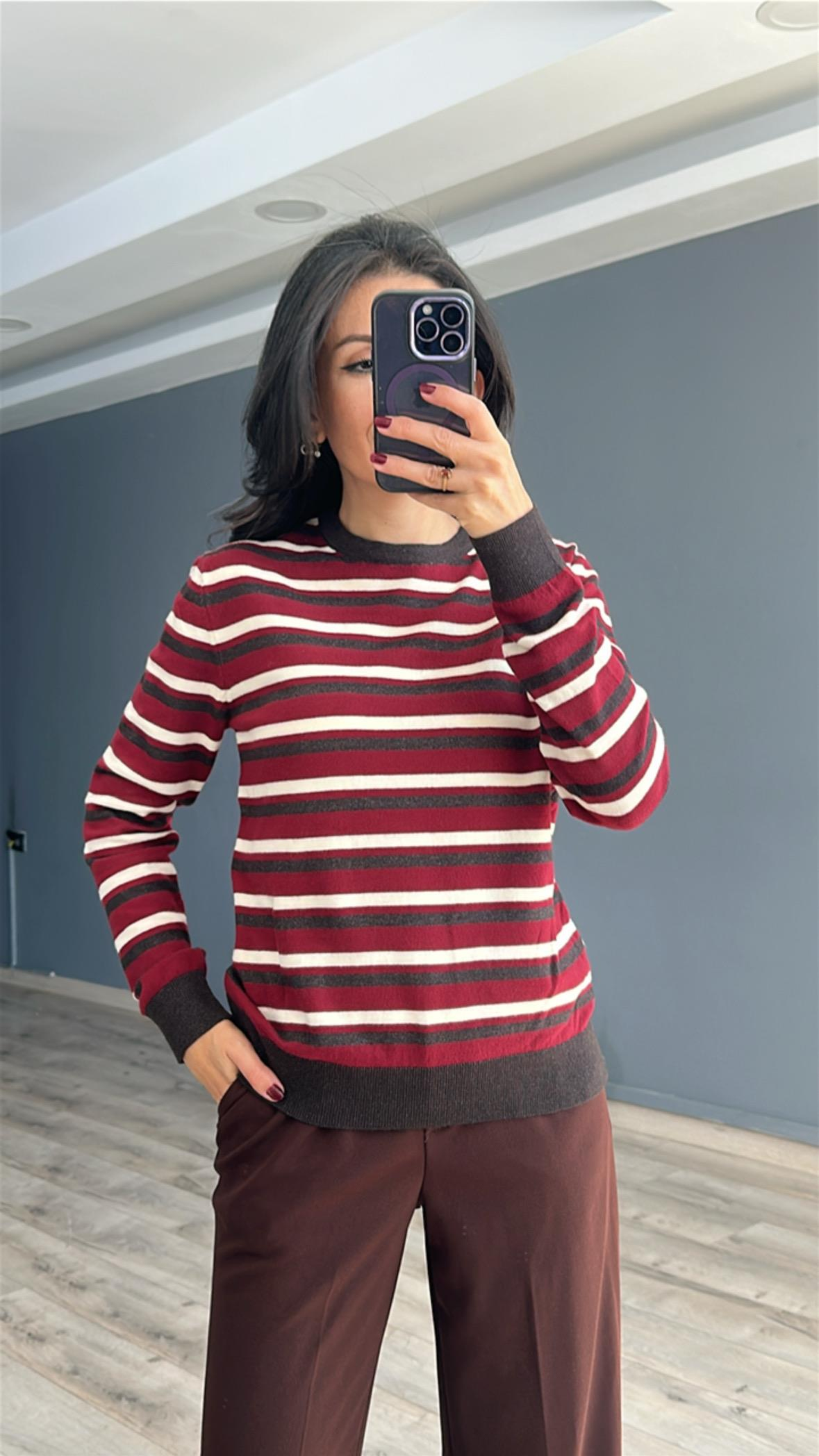Bordo Üzeri Antrasit Ekru Çizgili Bisiklet Yaka Triko