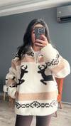 Ekru Kahve Geyik Desenli Fermuarlı Sweatshirt